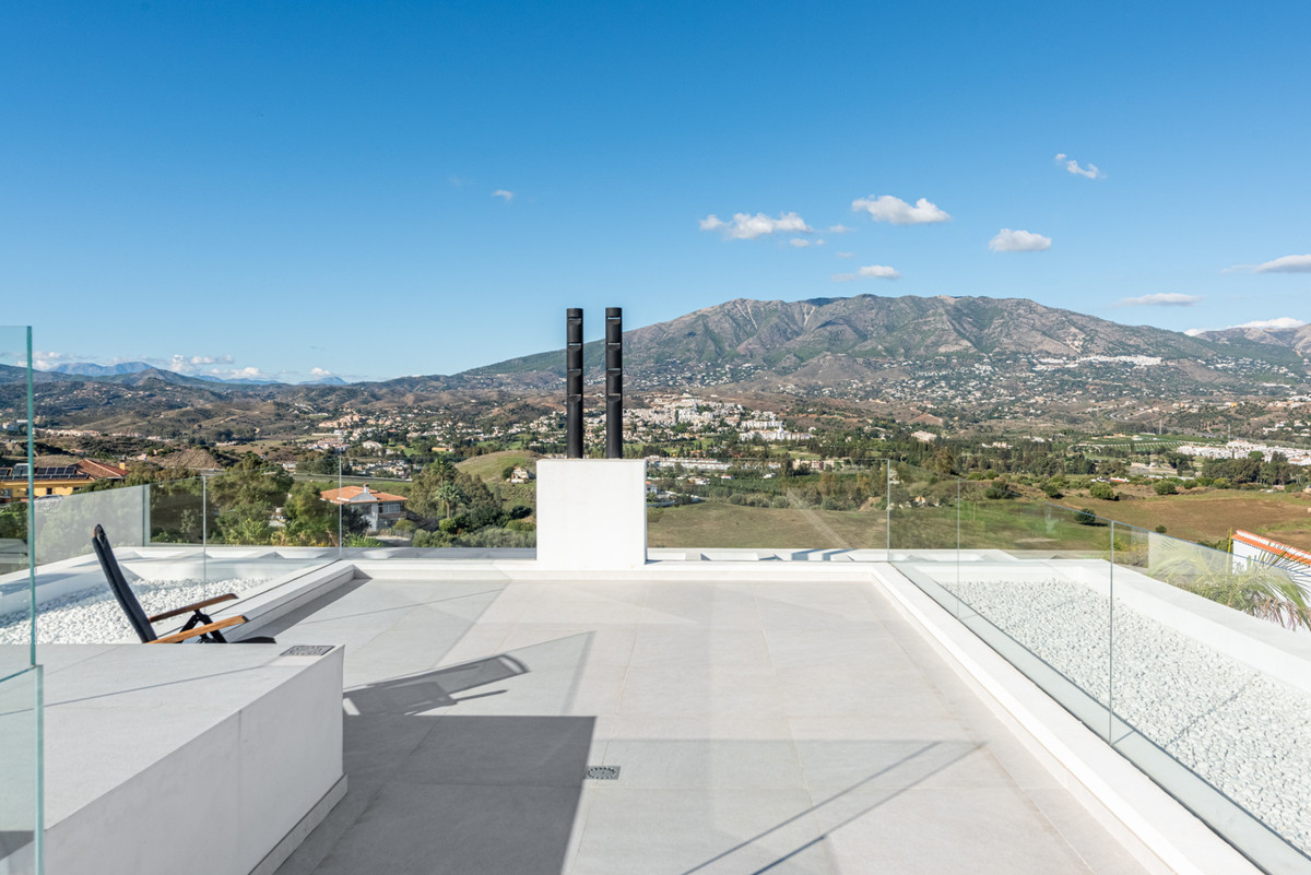 MODERNE LUXE VILLA MET PANORAMISCH UITZICHT – GEBOUWD IN 2024 Welkom in deze spectaculaire, nieuw gebouwde, moderne villa, een meesterwerk van modern design en comfort, opgeleverd in 2024. Deze woning is gunstig gelegen ten opzichte van de adembenemende panoramische uitzichten over de vallei, de bergen en de Middellandse Zee. De woning biedt uitzonderlijke privacy en elegante, lichte woonruimtes. BEGANE GROND – OPEN WONINGPLAN & NAADLOZE BINNEN-BUITEN-STROOM De begane grond beschikt over een ruime woonkamer en een open designkeuken met kamerhoge ramen die het prachtige berglandschap omlijsten. Vanaf hier lopen de woonruimtes op natuurlijke wijze over in de zorgvuldig aangelegde tuin en het verwarmde zoutwater infinity pool. Deze verdieping beschikt tevens over een royale gastensuite met een en-suite badkamer en een stijlvol gastentoilet. Een privélift verbindt alle verdiepingen van het huis. BOVENVERDIEPING – LUXE SLAAPKAMER SUITES & PANORAMISCH TERRASSEN Boven vindt u twee ruime slaapkamersuites, elk met een eigen badkamer en suite en directe toegang tot een groot terras met adembenemend uitzicht. Een apart terras op het zuiden leidt naar een wenteltrap die u naar het indrukwekkende dakterras brengt. DAKTERRAS – 360° UITZICHT & VOLLEDIGE PRIVACY Het ruime dakterras biedt een ononderbroken 360-graden uitzicht over de vallei, de bergen en de zee. Het is een ideale plek voor een jacuzzi, een relaxruimte of gewoon om in alle privacy te genieten van vredige zonsondergangen. BENEDENVERDIEPING – FLEXIBELE RUIMTE & RUIME GARAGE De begane grond biedt volop extra ruimte, waaronder bergingen, een wasruimte, een bijkeuken en een grote garage met ruimte voor meer dan vier auto's. Deze verdieping biedt ook interessante mogelijkheden voor personalisatie: een deel van de ruimte kan worden omgebouwd tot een bioscoop, fitnessruimte, wijnkelder of zelfs een zelfstandig gastenverblijf. BUITENLEVEN – ONTWORPEN VOOR ZON, SCHADUW EN ONTSPANNING De buitenkant is zorgvuldig ontworpen met diverse plekken om te dineren, te ontspannen in de schaduw of te zonnebaden bij het verwarmde infinity pool. Het milieuvriendelijke zwembad is voorzien van een elektrische afdekking die zonne-energie gebruikt om het water op natuurlijke wijze te verwarmen. FUNCTIES – Hoogwaardige materialen overal – Smart home systeem bediend via mobiele app – Verwarmd zoutwater infinity zwembad met zonne-ondersteunde afdekking – Lift naar alle verdiepingen – Ruime terrassen, waaronder een volledig 360° dakterras Deze villa combineert opvallende, eigentijdse architectuur met hoogwaardige functionaliteit en creëert een luxe, privé-resort dat is ontworpen voor het beste moderne leven. Afstanden: Luchthaven 25 min, 30 km Winkelcentrum Miramar 8 min, 4,4Km Fuengirola 15 min, 6 km Strand 9 min, 5 km Marbella 30 min, 28 km Malaga Centrum 40 min, 38Km.