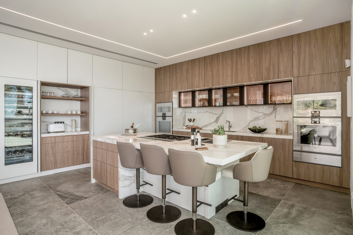 Vanaf het moment dat u aankomt, wordt u verwelkomd door een horizon die eindeloos lijkt door te lopen. Met panoramische uitzichten die zich uitstrekken van de Middellandse Zee tot de Afrikaanse kust. Het eigentijdse ontwerp versterkt deze ervaring, met open interieurs die moeiteloos opgaan in de natuurlijke omgeving. Ramen van vloer tot plafond en ruime woonruimtes creëren een naadloze overgang tussen binnen en buiten, waardoor de ruimte wordt gevuld met natuurlijk licht, frisse lucht en ononderbroken uitzichten vanuit elke hoek. Deze villa beschikt over een privéspa met een verwarmd binnenzwembad, sauna, stoombad en een aparte massageruimte. Een volledig uitgeruste fitnessruimte met Eleiko-apparatuur stelt u in staat om actief te blijven zonder uw huis te verlaten, terwijl de ruime entertainmentkamer de ideale setting biedt voor filmavonden, spelletjes of gewoon om te ontspannen met familie en vrienden. De keuken is voorzien van hoogwaardige Gaggenau-apparaten en strakke kasten van Danespan, waarmee modern design en dagelijkse functionaliteit worden gecombineerd. Een aangrenzend thuiskantoor biedt een rustige plek om te werken of te studeren. Een uniek hoogtepunt van de villa is de openluchtbioscoop bij het zwembad, een uitzonderlijke plek om te ontspannen onder de sterrenhemel en een extra vleugje luxe toe te voegen aan uw avonden in de buitenlucht. Binnen vindt u zes royale slaapkamers, elk zorgvuldig ontworpen met hoogwaardige afwerkingen en een rustgevende sfeer. Of ze nu gebruikt worden als gastenkamers, familiekamers of privéwerkruimtes, elke slaapkamer biedt zijn eigen unieke charme en comfort. Verder zijn er zeven complete badkamers en drie gastentoiletten verspreid over het pand. De master suite is werkelijk uitzonderlijk. Deze suite is strategisch gelegen om een adembenemend uitzicht op zee te bieden en beschikt over een op maat gemaakte inloopkast en een luxe en-suite badkamer met hoogwaardige armaturen en een serene, spa-achtige sfeer – een oase van rust in huis.