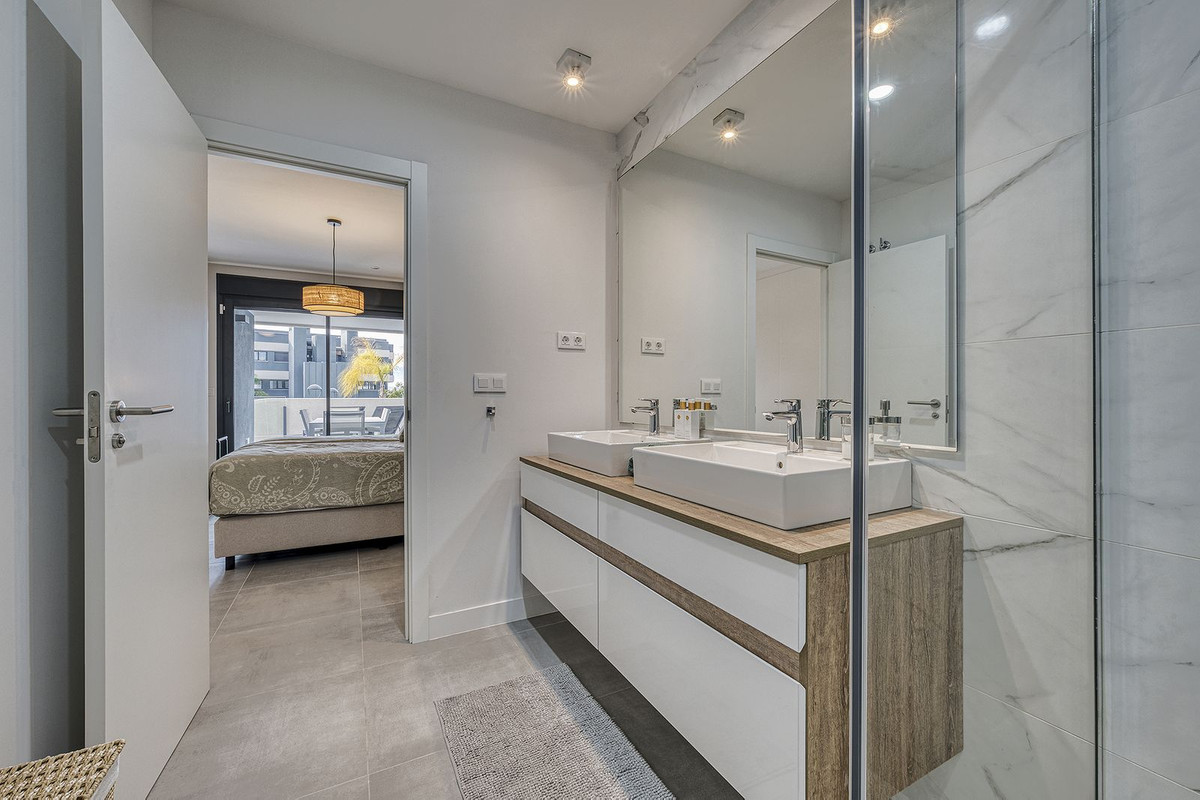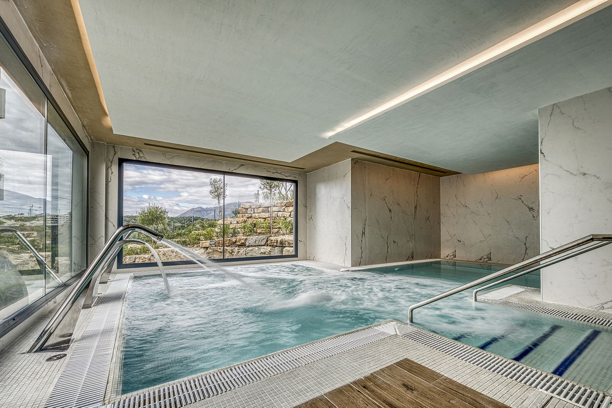 Stijlvol appartement met 2 slaapkamers in La Resina Golf, Estepona Dit elegante appartement met 2 slaapkamers en 2 badkamers bevindt zich op de eerste verdieping van een modern wooncomplex in La Resina Golf, Estepona. De woning beschikt over een ruim terras van 31 m² met een prachtig, open uitzicht over de tropisch aangelegde binnentuin, wat zorgt voor een rustige en ontspannen sfeer. Het appartement is ontworpen volgens een eigentijds concept en biedt veel natuurlijk licht, een evenwichtige indeling en hoogwaardige afwerkingen. De woonkamer loopt naadloos over in het terras, waardoor binnen- en buitenleven perfect in elkaar overvloeien – ideaal om het hele jaar door te genieten van het mediterrane klimaat. Het appartement is op het zuidwesten georiënteerd, waardoor er de hele dag door volop zonlicht is. De woning wordt verkocht inclusief een ondergrondse parkeerplaats en een berging. Het complex biedt uitstekende gemeenschappelijke voorzieningen, waaronder een prachtige spa met uitzicht op de omringende natuur, een verwarmd binnenzwembad, een sauna, een hamam en ontspanningsruimtes. Daarnaast kunnen bewoners genieten van een groot buitenzwembad en zorgvuldig aangelegde tuinen die bijdragen aan de exclusieve en rustige levensstijl. Gelegen in het groene en rustige La Resina Golf, perfect gepositioneerd halverwege tussen Estepona en Marbella, combineert deze woning natuur, comfort en uitstekende bereikbaarheid. Dankzij de centrale ligging, de indeling en de hoogwaardige voorzieningen is het ideaal als permanente woning en tegelijkertijd een topverhuurobject, geschikt voor zowel korte als lange termijn verhuur.