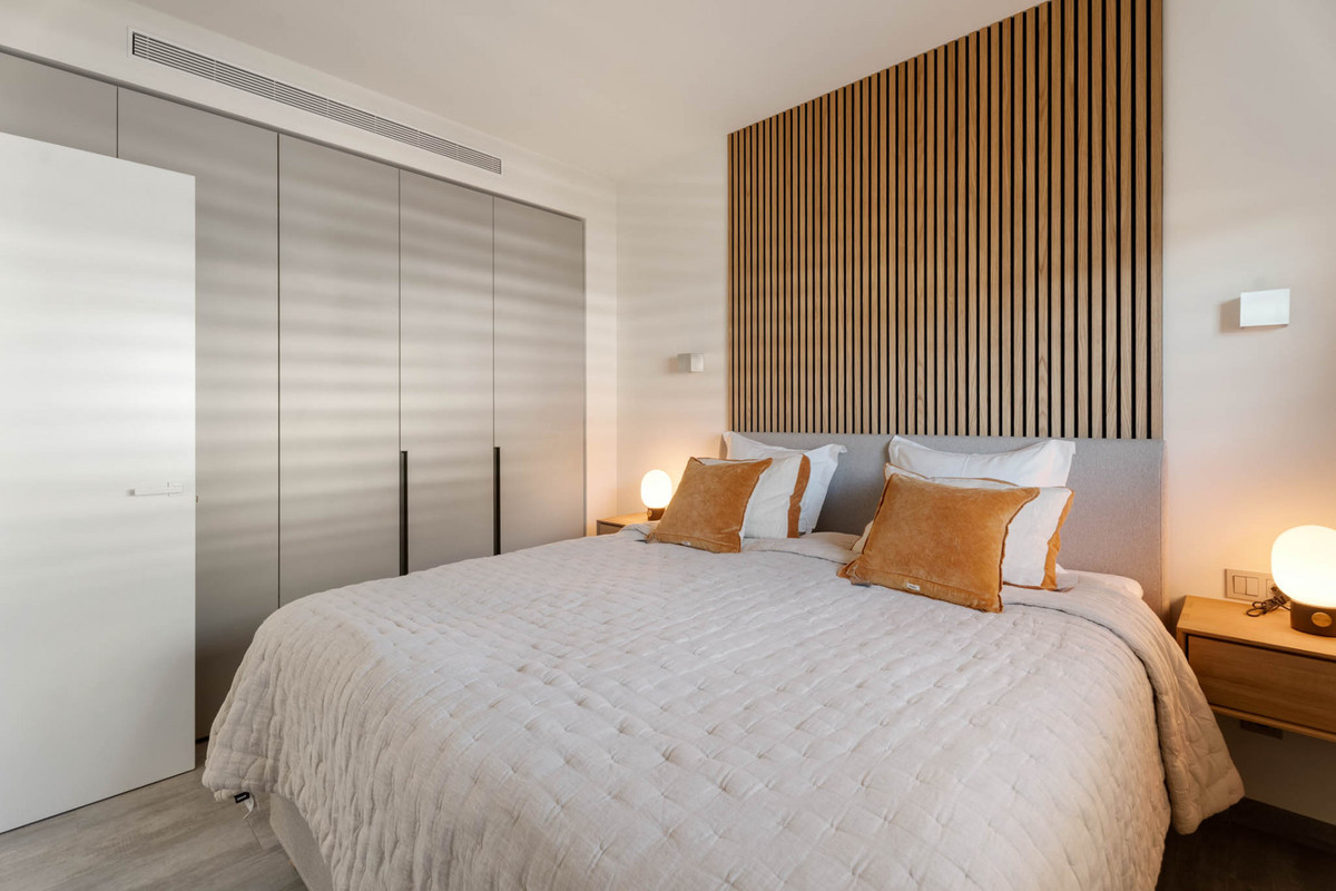 Situaded within a secure residential enclave in El Higuerón, this brand-new three-bedroom corner apartment offers refined contemporary living with open sea and valley views. Located in the most elevated and private phase of the development, the property benefits from protected outlooks due to the agricultural land set in front, preserving long-term views and privacy. With a total built interior of 117,11 m² and a spacious corner terrace, the residence is designed to create a seamless connection between indoor and outdoor living. The southwest orientation ensures natural light throughout the day and evening sunsets over the Mediterranean. The interior layout is carefully arranged. The living and dining area extends across 36.56 m², directly connected to the terrace, creating an ideal setting for entertaining or quiet retreat. The Italian Zampieri kitchen is fitted with AEG appliances and finished with clean architectural lines and functional storage. Saloni ceramic flooring runs throughout the home, reinforcing a cohesive aesthetic. The primary suite measures 17.48 m² and includes fitted Santalucia Mobili wardrobes and an en-suite bathroom with underfloor heating. Two additional bedrooms (12.13 m² and 12.88 m²) share a second bathroom, also with underfloor heating. A separate laundry room adds practicality to the layout. Built in 2025 to European CTE building standards, the apartment incorporates aerothermal climate control for efficient heating and cooling, technical exterior carpentry for enhanced thermal and acoustic insulation, and an upgraded domotics system. Blinds, lighting, and climate settings are managed via wall panels or mobile application. Integrated smart features include flood detection with automatic water shut-off, smoke detection, and power-cut alerts. The property is sold fully furnished by BoConcept and includes two underground parking spaces and a storage room. Residents enjoy landscaped gardens, an infinity pool with sun loungers, and 24-hour gated security. The apartment is within walking distance of Higuerón Resort, spa, and sports facilities, five minutes from the beach, 15 minutes from Málaga Airport, and 20 minutes from Málaga city. Property Highlights - 3 bedrooms | 2 bathrooms | 1 en-suite - 117,11 m² built interior - 81,57m² southwest-facing terrace - Sea and green valley views - Italian Zampieri kitchen with AEG appliances - Underfloor heating in bathrooms - Aerothermal climate control system - Advanced home automation system - Fully furnished by BoConcept - 2 underground parking spaces - Private storage room - 24-hour gated community with infinity pool