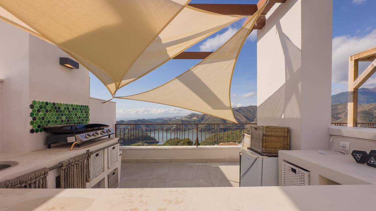 Exclusive Corner Penthouse with Rooftop Terrace and Panoramic Views over Istán and Marbella Set on a privileged corner position high above the picturesque Istán reservoir, this exceptional corner penthouse offers an elevated lifestyle where luxury, nature and breathtaking views come together in perfect harmony. Surrounded by tranquility and greenery, yet just minutes from Marbella’s vibrant lifestyle, this property is truly one of a kind. The penthouse is fully furnished with a stylish and sophisticated interior, combining elegant design with maximum comfort. Thanks to its corner orientation and expansive floor-to-ceiling windows, the property benefits from abundant natural light and an open, airy atmosphere, with spectacular views from almost every angle. The generous terraces are beautifully designed and adorned with striking cacti, creating an exclusive Mediterranean ambiance. From here, the views stretch across the shimmering Istán lake, the Mediterranean Sea, and on clear days reach as far as Gibraltar and the coastline of Morocco. A true highlight of this residence is the private rooftop terrace, perfectly created for outdoor living and entertaining. It features a fully equipped outdoor kitchen, a spacious dining table for eight guests, a sun cover for shade, and a luxurious jacuzzi, offering the ultimate setting to relax while enjoying unforgettable sunsets over the sea. The property also includes a double garage and a separate storage room, ensuring practicality without compromising on luxury. Despite its serene location, the glamorous marina, designer boutiques and fine dining of Puerto Banús are just a seven-minute drive away. An extraordinary corner penthouse for the discerning buyer seeking privacy, panoramic views and refined living on the Costa del Sol.