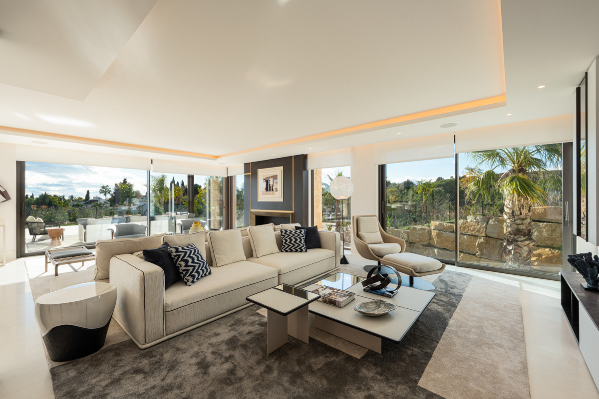 This exceptional luxury villa in Marbella Hill Club seamlessly blends refined elegance with effortless comfort, offering an exclusive lifestyle in one of Marbella’s most prestigious enclaves. The bespoke interiors by Pedro Peña are uniquely tailored to this residence, creating a sophisticated yet welcoming atmosphere that feels both timeless and distinctive. A calming neutral palette, enriched with natural materials such as wood and marble, enhances the sense of understated luxury, while meticulous attention to detail elevates every space. The open-plan living areas are thoughtfully designed to create a harmonious flow while maintaining defined zones for relaxation and entertainment. The living room invites comfort and tranquillity, complemented by curated artwork and bespoke finishes that add character and individuality. The contemporary kitchen is both stylish and functional, equipped with state-of-the-art appliances and a wine cooler, making it ideal for both everyday living and elegant entertaining. Each bedroom is beautifully appointed with premium materials and refined décor, offering a serene and luxurious retreat. The bathrooms feature double vanities, walk-in showers, and freestanding bathtubs, delivering a spa-like experience. This remarkable property also includes an exclusive bar and entertainment room, a fully equipped gym, a Turkish bath, and an indoor pool, creating a private wellness and leisure sanctuary. Set on a generous plot, the villa offers extensive outdoor areas designed to enjoy the Mediterranean lifestyle, including multiple seating areas, a private swimming pool, and breathtaking sea views. The impressive solarium features an outdoor kitchenette and additional space for relaxation and entertainment. Ideally located near the Marbella Golden Mile, this outstanding villa represents a rare opportunity to own a truly bespoke luxury residence that perfectly balances sophistication, comfort, and prime location.